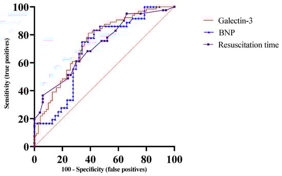Among successfully resuscitated OHCA patients, 68 (47.2%) died during index hospitalization and 76 (52.8%) survived to discharge. The in-hospital mortality group was more likely to have a history of prior diuretic use (p = 0.02). There was no significant difference in initial and peak troponin-I, CK, and lactate levels between patients with in-hospital mortality versus survivors. Patients who died had a significantly higher galectin-3, higher BNP, lower pH, longer resuscitation time, and longer QTc compared to survivors (41.3 ng/mL (IQR 28.23–68.48) vs. 20.95 ng/mL (IQR 9.8–38.68), p < 0.0001; 1044 ± 1576 pg/mL vs. 483.4 ± 776.1 pg/mL, p = 0.04; 7.13 ± 0.17 vs. 7.21 ± 0.15, p = 0.01; 21.2 ± 30.4 min vs. 9.5 ± 8.1 min, p = 0.0005; 456.6 ± 50.3 ms vs. 434.3 ± 56.3 ms, p = 0.01, respectively). ROC analysis for predicting in-hospital deaths showed that galectin-3 had the highest AUC (0.74, p < 0.0001) for predicting mortality (Figure 1).
