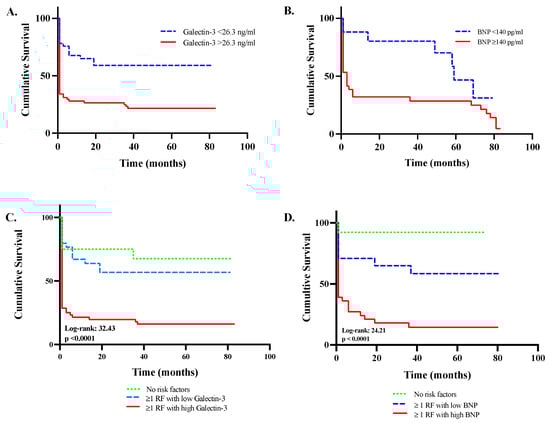 Combinatorial analysis of all-cause mortality using Kaplan–Meier survival plot in resuscitated out-of-hospital cardiac arrest patients (OHCA). Cumulative survival based on prognostic thresholds of galectin-3 (A) and BNP (B) levels. Survival plots compared based on presence of risk factors in combination with serum levels of galectin-3 (C) and BNP (D) above and below their respective prognostic thresholds. Risk factors are significant variables derived from univariate analysis including the following: (1) use of diuretics or statins prior to OHCA, (2) history of diabetes or CKD, (3) age > 66.5 years, (4) resuscitation time of >11.5 min, (5) initial rhythm asystole, (6) hemoglobin level < 13.5 mg/dL, (7) eGFR < 42 mL/min/1.73 m2, (8) arterial pH < 7.1, or (9) QTc > 440 ms. BNP = brain natriuretic peptide; CKD = chronic kidney disease; OHCA = out-of-hospital cardiac arrest; RF = risk factor.