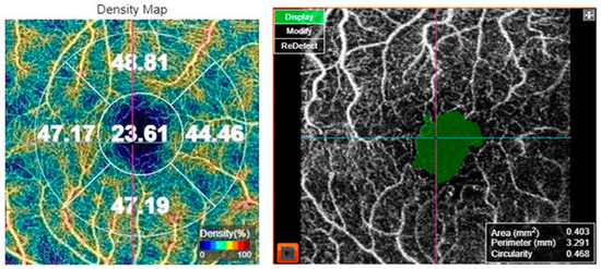 For OCT-A acquisition, the 3 × 3 mm protocol for macular OCT-A. The scan was verified for foveal centration. In cases with decentration, the early treatment of diabetic retinopathy study (ETDRS) grid was centered on the fovea manually. The superficial capillary plexus was segmented by the automated software. Macular vascular density (MVD) was measured by the manufacturer’s software in the superficial capillary plexus slab. MVD was measured in five regions: central, inner superior, inner nasal, inner inferior, and inner temporal subfields of the ETDRS grid. Moreover, FAZ metrics including FAZ area, FAZ perimeter, and FAZ circularity index were assessed, as shown in Figure 1. Optic nerve head angiography was also performed using the 4.5 × 4.5 mm protocol. The scan was centered on the optic disc. All images were captured by the same investigator (CA). The OCT-A images were analyzed for the presence of artifacts and in such cases, the images were captured again. Only images with a scan quality score > 55 were included in the analysis; poor-quality images prior to data analysis were rejected by the operator and the scan was repeated until good quality was achieved.