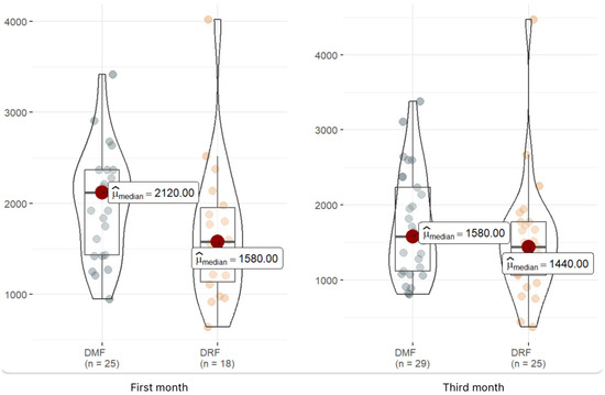 Figure 1 shows that the lymphocyte levels are lower in patients treated with DRF in the first and third months, but this difference is significant only in the first month.