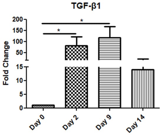 The TGF-β1 mRNA levels increased gradually on day 2 and day 9 compared to the day of operation (day 0), before decreasing on day 14 (Figure 1).