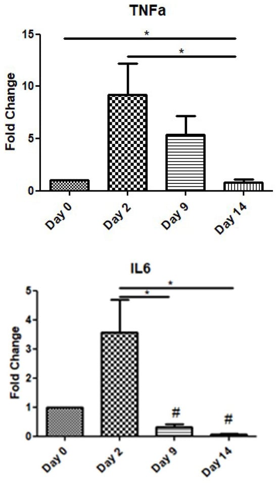 In order to assess the role of inflammatory cytokines during the wound-healing process, we examined the expression levels of TNF-a and IL-6 over time. TNF-a showed a peak increase on day 2, before gradually decreasing on day 9, while on day 14, its expression level was below that at day 0. Similarly, IL-6 also exhibited an increase on day 2, before decreasing on days 9 and 14 below the expression levels of day 0 (day of operation) (Figure 2).