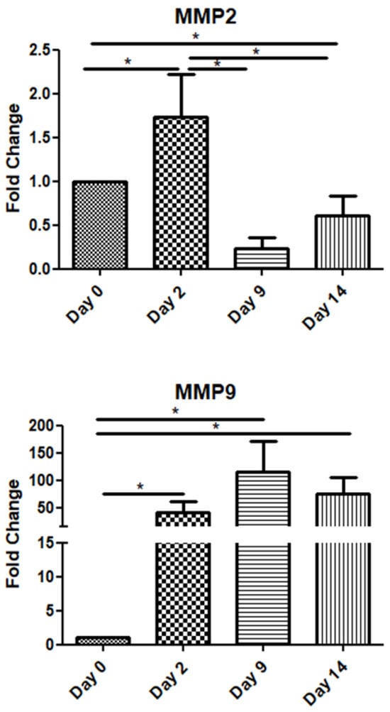 Among the metalloproteinase family members, in this study, we examined two of the most representative ones, namely MMP-2 and MMP-9. The MMP2 mRNA expression increased on day 2 and declined on days 9 and 14. Interestingly, MMP-9 exhibited high expression throughout the observation period, i.e., up to day 14 post-operation (Figure 4).