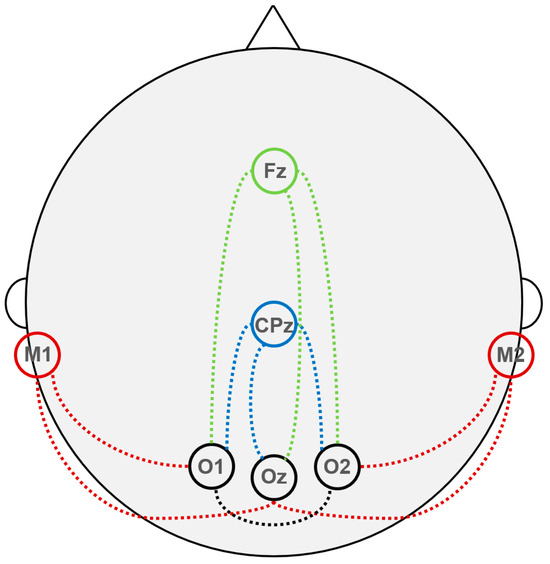 When VEPs are recorded for clinical diagnostic purposes, it is generally recommended to place the reference electrode at the Fz position [10] of the 10–10 [18] EEG electrode placement system (Figure 1, green); the same placement is sometimes utilized for the intraoperative monitoring of these EPs [23,24,25]. However, under general anesthesia, the characteristics of the background bioelectrical activity can change significantly. In particular, during anesthesia with propofol, which is considered the preferred anesthetic for monitoring VEPs [26], anteriorization of the alpha rhythm occurs [27]. A similar effect was also observed in some patients under inhalation anesthesia with sevoflurane [28]. As a result, the reference electrode in the frontal region may become a source of high-amplitude “alpha EEG noise”, making it preferable to place reference electrodes in other areas where background EEG activity is lower. Indeed, alternative reference electrode placements have been documented on the earlobes (A1/A2) [25,26,29,30,31], on the mastoids (M1/M2) [32,33] (Figure 1, red), and posterior to the vertex (CPz) [34,35,36] (Figure 1, blue).