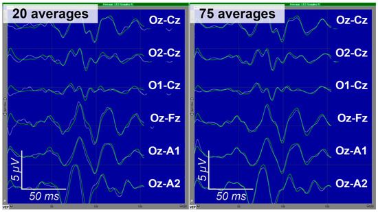 Example of excellently reproducible VEPs obtained using 15–300 Hz frequency filter. In both panels, baselines are represented by thicker green lines; they were recorded earlier with 100 averages. The thinner white lines represent results recorded with 20 (left panel) and 75 (right panel) averages under identical conditions, suggesting that there is no need to accumulate more averages after 20. Additionally, the between-derivation variability in VEP amplitudes is clearly observable. Adapted from [37] “Intraoperative monitoring of visual evoked potentials: experience of 240 operations”, by E.A. Levin, M.G. Kilchukov and A.A. Glushaeva, 2024, Neyrokhirurgiya = Russian Journal of Neurosurgery, 26(3), p. 59, Figure 1c (https://doi.org/10.17650/1683-3295-2024-26-3-57-71). CC BY 4.0 (https://creativecommons.org/licenses/by/4.0/, accessed on 20 November 2024).