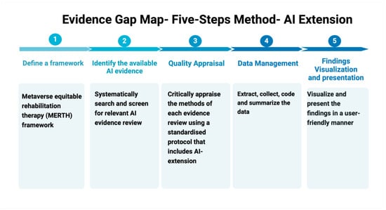 Two frameworks have been employed in this protocol and will be used in the study: Population, Intervention, Comparator, Outcomes, Timing, Setting, and Study Design (PICOTSS) [20] and Metaverse Equitable Rehabilitation Therapy (MERTH) (Figure 2) [21] frameworks, each serving distinct purposes. The PICOTSS framework guides the formulation of search terms and the organization of the literature review, ensuring a systematic and comprehensive search process. In contrast, the MERTH framework focuses specifically on equity considerations within the study. It is used to evaluate disparities in access to and outcomes from AI-powered interventions, emphasizing demographic variables such as gender, socioeconomic status, and geographic location. The integration of these frameworks ensures methodological rigor in evidence synthesis while providing a comprehensive analysis of equity issues, supporting the study’s broader objectives of promoting inclusivity and fairness in AI technologies for older adults.