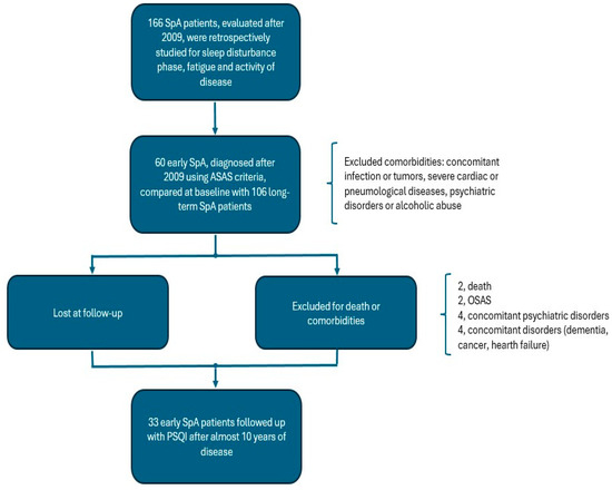 At T2, the clinical data of 45 e-SpA, not lost at 10 years of follow-up, were studied: 2 had died, 4 were excluded due to psychiatric problems (3 were diagnosed with psychotic disorders and 1 with major depressive disorder) and 4 for other severe chronic diseases (1 breast cancer, 1 heart failure and 2 dementia). From the 35 e-SpA patients included and investigated with PSQI, two patients were selected for polysomnography examination and excluded for nocturnal apnea diagnosis. Finally, 33 e-SpA patients without comorbidities were selected for T2-PSQI and T2-disease activity evaluation. No patients included were hospitalized for COVID-19 infection or were obese (BMI > 30) during follow-up.