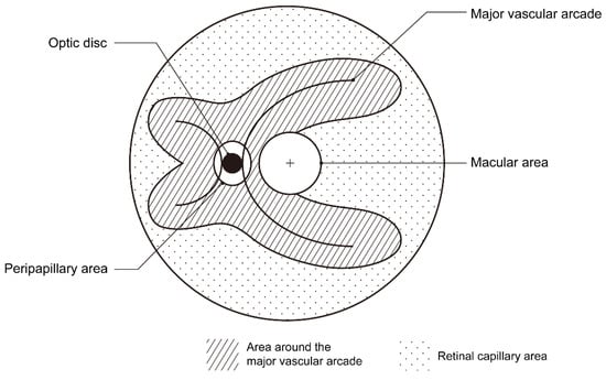 A diagram of the area around the major vascular arcade (MVA) and retinal capillary area (RCA). The MVA area encompassed approximately 1–2 disc diameters around the visible retinal artery and vein, while the other area constituted the RCA.