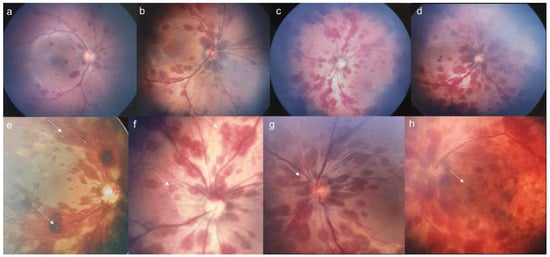 The upper row demonstrates the increase in hemorrhages as the grade becomes more severe. Retinal hemorrhages were shown only around the MVA in grade 1 (a) and 2 (b). Whitish cores were observed in grade 3 hemorrhages located both in the MVA area and RCA (c,d). The lower row shows the representative characteristics of retinal hemorrhages. Whitish dots (e,f), peripapillary hemorrhages (g), and macular involvement (h) are shown. Arrows indicate the specific characteristics in each image.