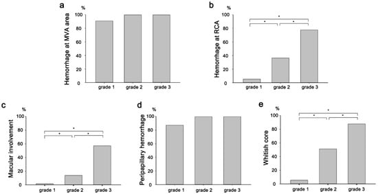 Hemorrhages around the major vascular arcade (MVA) were frequently observed regardless of the grade, while those in the retinal capillary area (RCA) predominantly had higher grades (a,b). Peripapillary hemorrhages can be observed in most eyes, while macular involvement is associated with high-grade hemorrhages (c,d). The whitish core appeared related to the hemorrhage grade (e). Asterisks (*) indicate a statistically significant difference (p < 0.05).