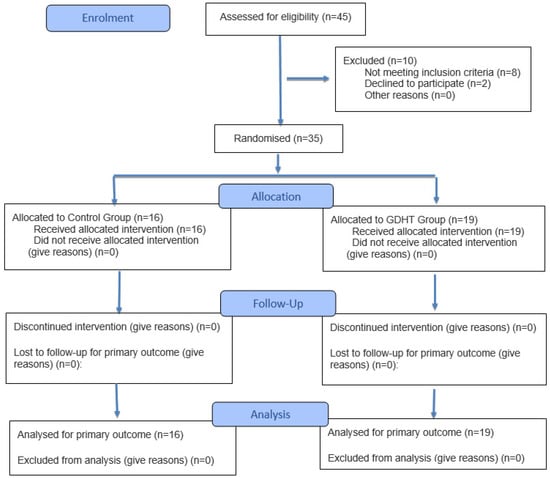 The study was performed for two years. In this period, 45 patients were scheduled for open large liver resection (two or more liver segments). No patient was excluded or dropped out of the study after randomization (N = 35). There were 16 patients in the control group and 19 patients in the GDHT group (Figure 2).