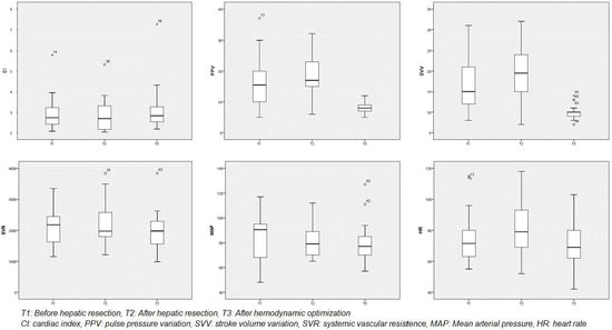 After hepatic resection and hemodynamic optimization according to protocol (Figure 1), there were statistically significant changes in VPP (T2: 19.37 ± 7.96 versus T3: 8.47 ± 1.5, p = 0.001), VVS (T2: 19.84 ± 7.05 versus T3: 9.95 ± 1.31, p = 0.001) and HR (82.26 ± 18.19 versus 20.53 ± 14.02, p = 0.001). In all other variables (CI, SVR, MAP) and times (T2-T1 and T3-T2) there are no statistically significant changes (Table 4 and Figure 3).