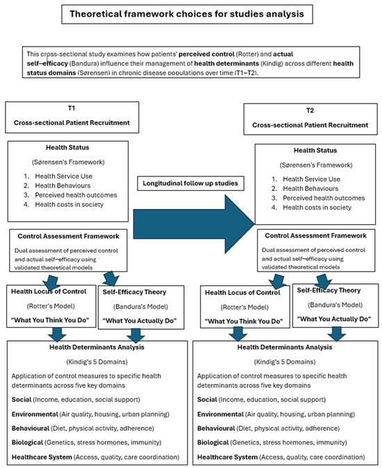 Chronic diseases account for approximately 41 million deaths annually, making up 74% of global mortality [1]. In France, two-thirds of deaths in 2018 were attributed to chronic conditions [2]. Chronic disease is characterized by a long-term pathological state associated with functional limitations and care dependency that affects daily life, yet individuals still retain some level of health potential [3]. This concept is known as “health-within-illness” [4,5] and has been described in several models. Kindig described five health determinant domains that influence health status, social (e.g., income, education, social support), environmental (e.g., air quality, urban planning), behavioral (e.g., diet, physical activity), biological (e.g., stress hormones), and healthcare system-related determinants [6]. Health determinant control has been described as two distinct dimensions [7,8,9]. Firstly, Bandura described a Self-Efficacy Theory, concerning the individual’s capacity to take concrete actions to control their health outcomes (“what you do”) [10]. Secondly, Rotter’s Health Locus of Control framework concerning the individual’s psychological sense of control over their health (“what you think you do”), which shapes their beliefs about their ability to influence their health trajectory and their motivation to engage in health-promoting behaviors [11]. Furthermore, Sørensen provided a more complex, four-domain health outcome framework to measure health status [12]. These models together measure the effect of key health determinant control on health status among patients living with chronic illnesses (Figure 1). Having an understanding of this less-explored concept is essential to understand and improve health outcomes in this population. The primary aim of this systematic review is to assess the impact of health determinant control on the health status of patients with chronic diseases.