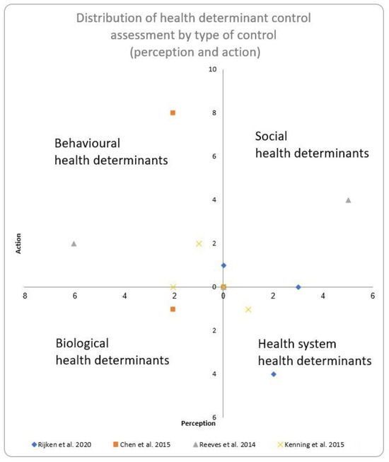 The heterogeneity between selected studies was assessed by mapping perceived or active control over four types of health determinants (biological, social, behavioral, and health system).