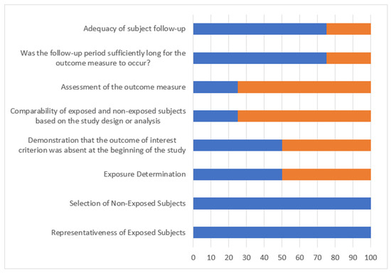 Newcastle–Ottawa risk of bias assessment graph (proportion of risk in orange color). The blue color represents the proportion of studies in which the risk of bias (named in the first column) was controlled/addressed in the studies included in the systematic review (and the orange was not controlled).