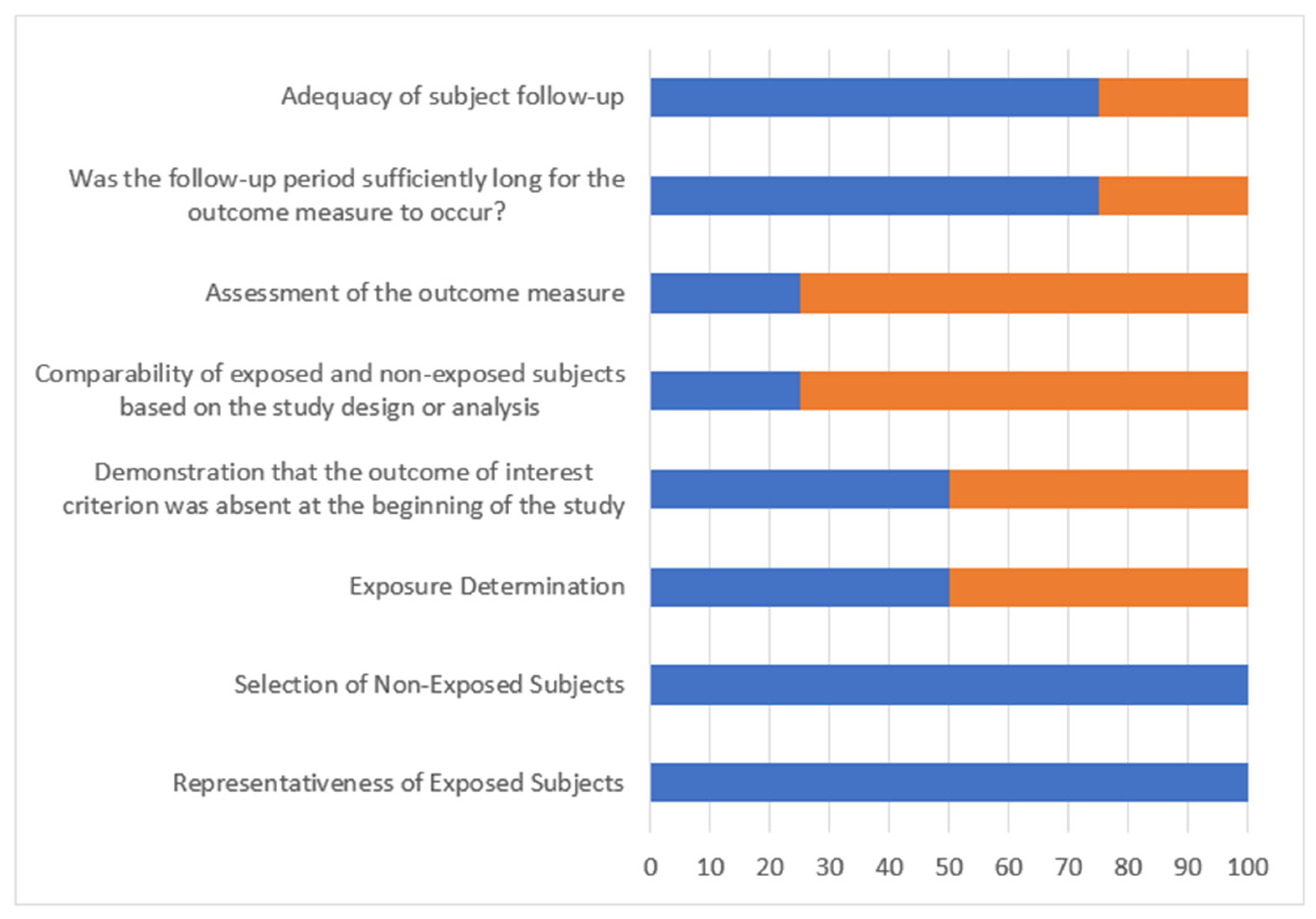 Representativeness of Exposed Subjects | Selection of Non-Exposed Subjects | Exposure Determination | Demonstration That the Outcome of Interest Criterion was Absent at the Beginning of the Study | Comparability of Exposed and Non-Exposed Subjects Based on the Study Design or Analysis | Assessment of the Outcome Measure | Was the Follow-Up Period Sufficiently Long for the Outcome Measure to Occur? | Adequacy of Subject Follow-Up | |