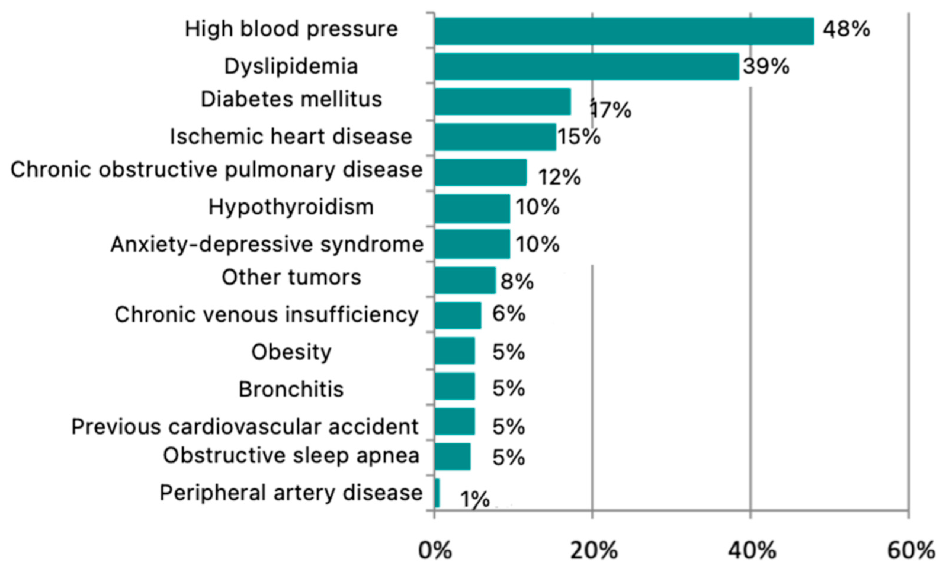 Over 80% of patients presented with at least one comorbidity, with arterial hypertension being the most common, present in nearly half of the cohort. This is a relevant finding considering the historical association between hypertension and increased risk of systemic bleeding [