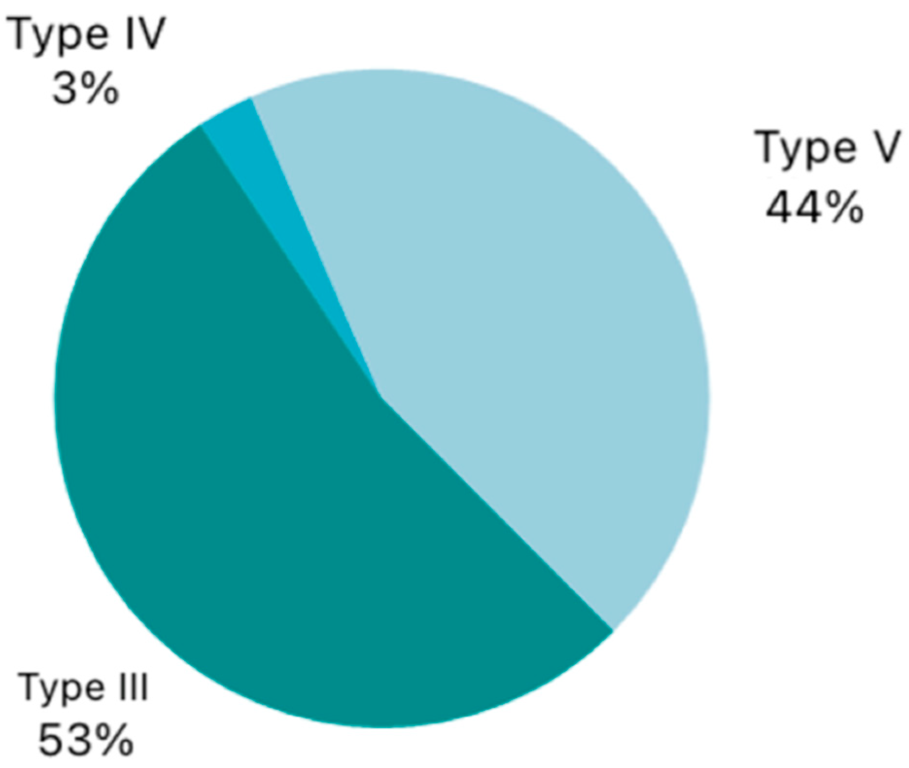 Regarding the type of surgical procedure performed, the majority of patients underwent a transmuscular cordectomy (Type III), accounting for 53.1% of cases. This was followed by extended cordectomy (Type V) in 44.1% of patients. A small subset underwent a complete cordectomy (Type IV), representing only 2.8% of the total (