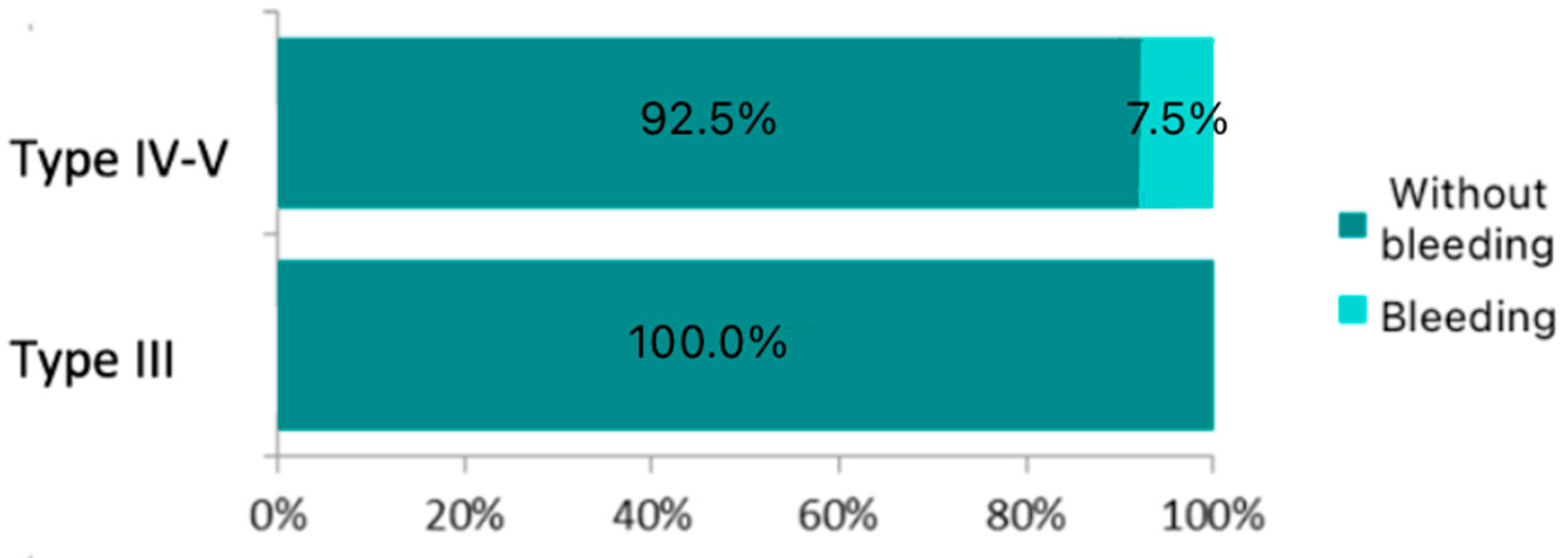 p-value = 0.021), with no bleeding reported in patients who underwent a transmuscular cordectomy (Type III) and a 7.5% risk observed in those who underwent total or extended cordectomy (Type V). Patients undergoing Type IV–V cordectomies had an odds ratio of 13.464 for postoperative bleeding compared to those who underwent Type III procedures, a statistically significant result (