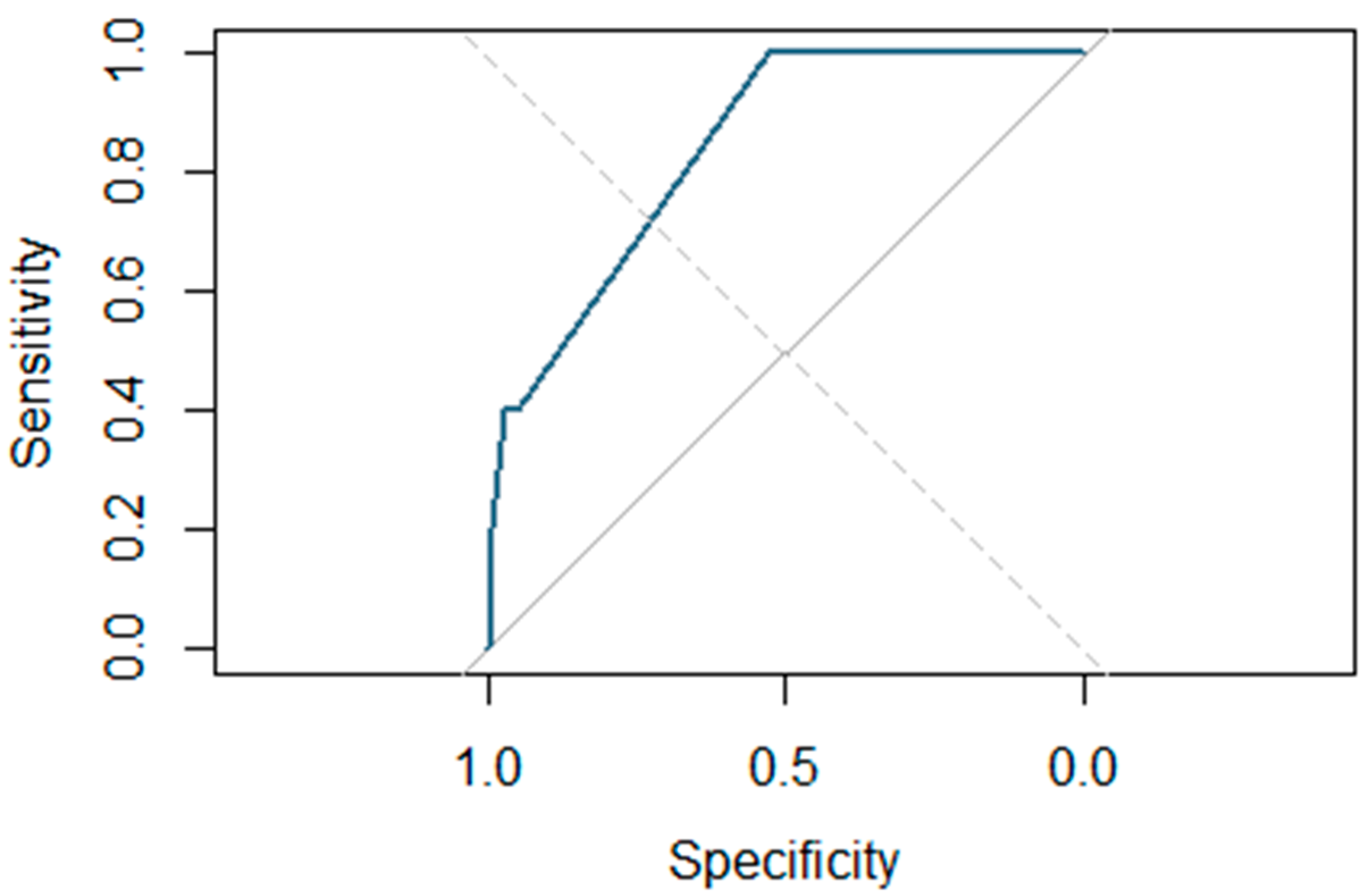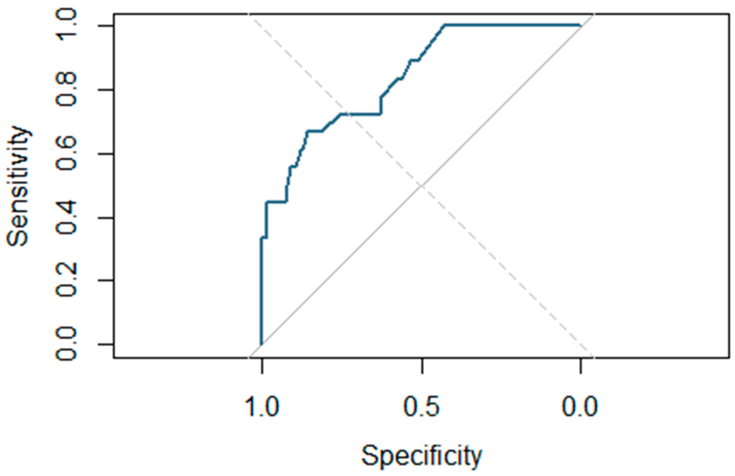 Figure 4, which shows the ROC curve associated with the final multivariate predictive model, which demonstrates high discriminatory power, with an area under the curve (AUC) of 0.839—higher than that of the univariate model (AUC = 0.775).