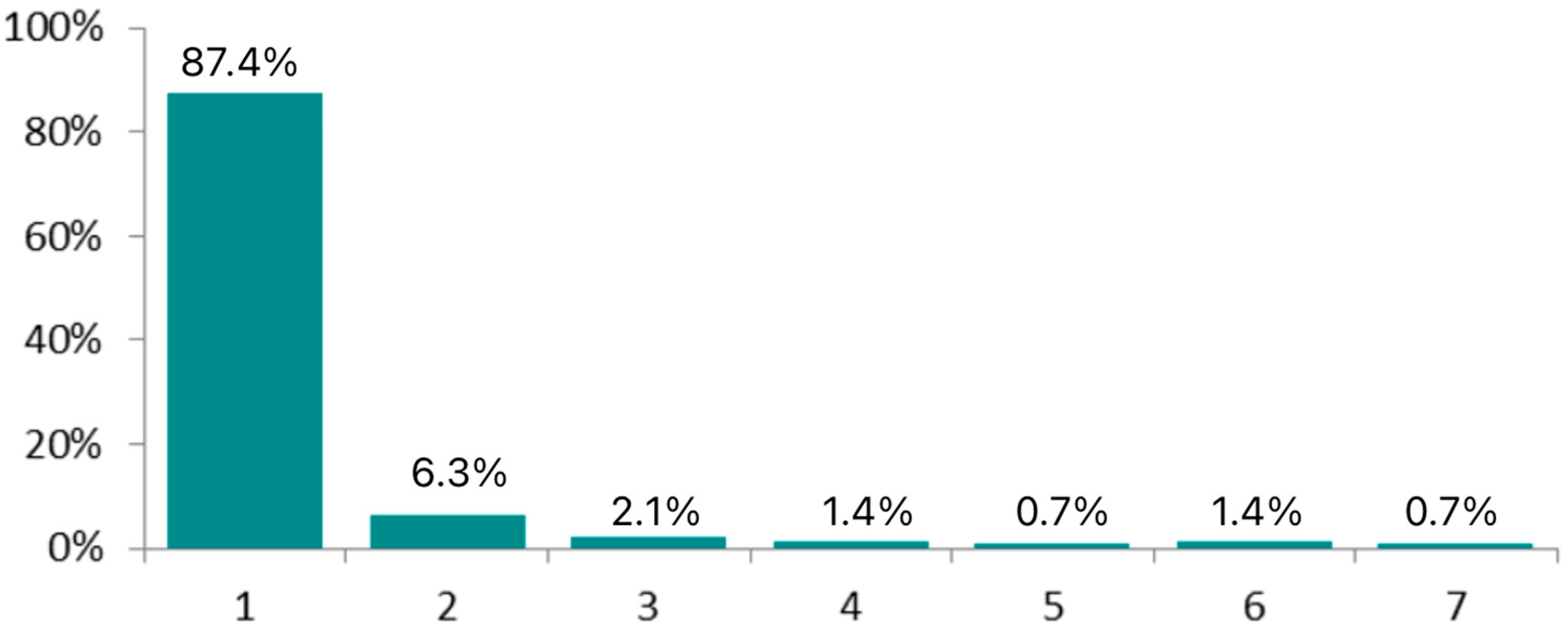 Figure 5 illustrates the distribution of hospital stay duration in this patient cohort, showing that nearly all patients (87.4%) required only a single day of hospitalization.