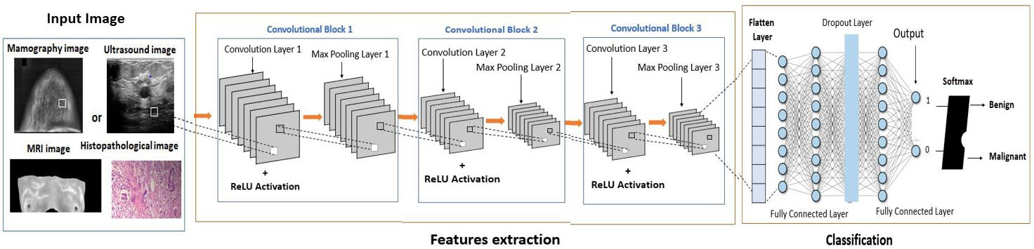 25] developed a CNN with five learnable layers (four convolutional and one fully connected) for breast cancer classification. The model automates feature extraction with fewer parameters and was rigorously tested on multiple mammography and ultrasound datasets (MIAS, DDSM, INbreast, BUS-1, BUS-2). It outperformed several methods, achieving 96.55%, 90.68%, and 91.28% accuracy on the MIAS, DDSM, and INbreast datasets, and 100% and 89.73% accuracy on the BUS-1 and BUS-2 datasets.