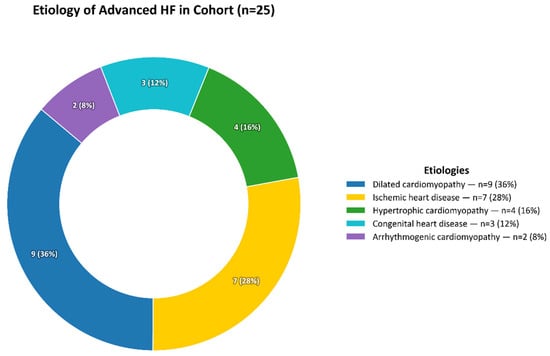 The etiology of heart failure was heterogeneous, with dilated cardiomyopathy (36%) being the most common, followed by ischemic heart disease (28%), hypertrophic cardiomyopathy (16%), congenital heart disease (12%), and arrhythmogenic cardiomyopathy (8%) (Figure 1).