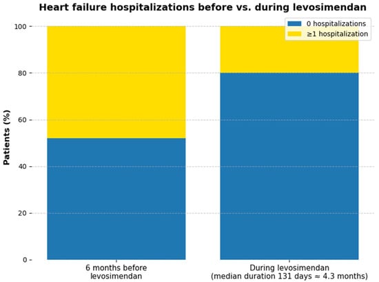 Hospitalizations for decompensated HF were fewer during levosimendan therapy than in the preceding 6 months (Figure 2) In total, 12 hospitalizations occurred before program initiation (48% of patients, corresponding to 0.079 events per patient-month), compared with 5 hospitalizations during levosimendan (20% of patients, 0.035 events per patient-month). This represents an absolute reduction in 7 events and a 28% decrease in the proportion of patients hospitalized (p = 0.033). Given the small sample size, these findings are best interpreted descriptively; p-values are reported as exploratory only.