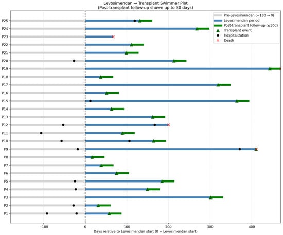 The individual trajectories from six months before levosimendan initiation through transplantation and 30-day post-transplant follow-up are shown in Figure 3. This swimmer plot illustrates the duration of levosimendan therapy, timing of transplantation, and early post-transplant outcomes, including survival or death within 30 days.