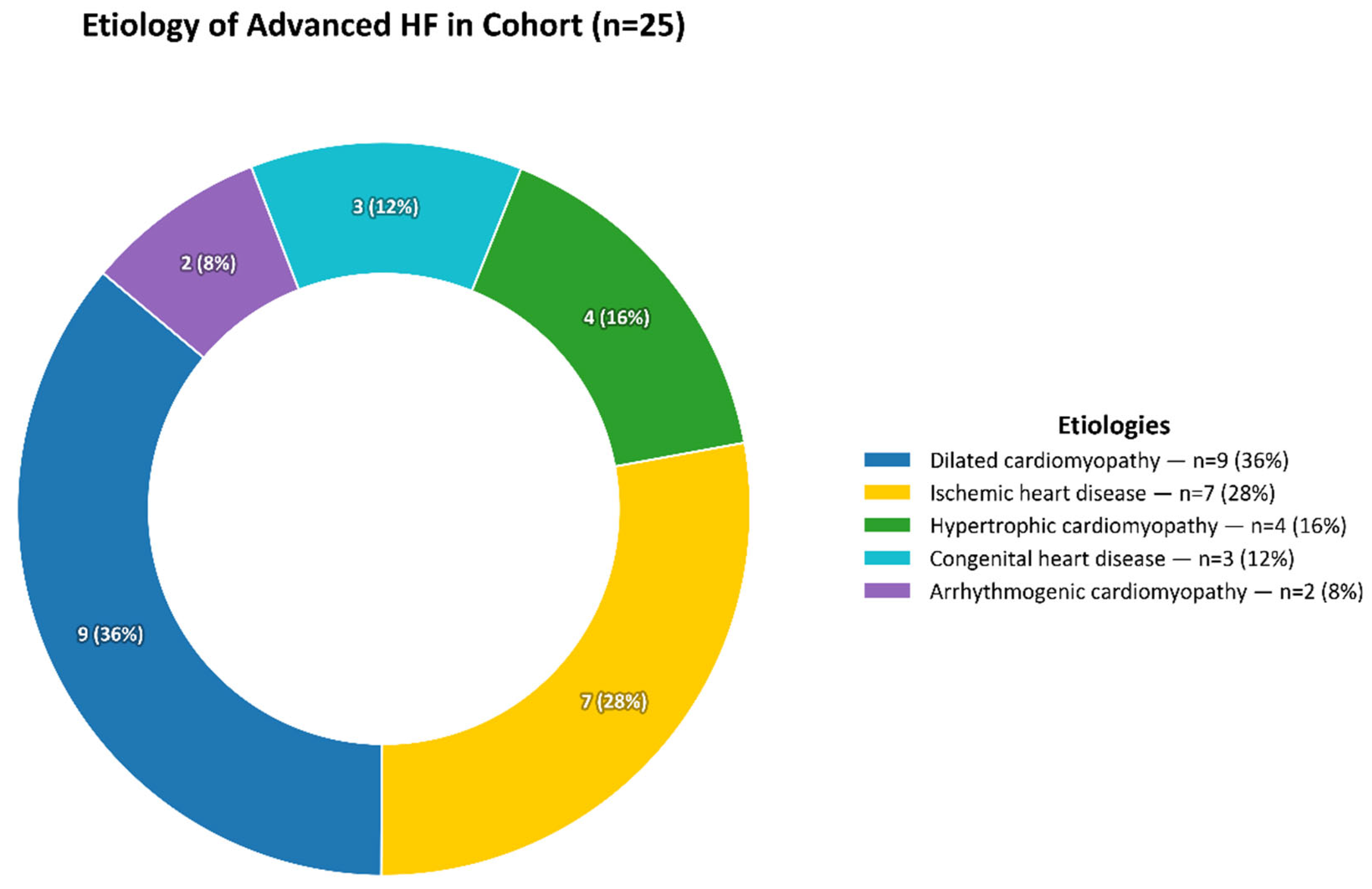 The etiology of heart failure was heterogeneous, with dilated cardiomyopathy (36%) being the most common, followed by ischemic heart disease (28%), hypertrophic cardiomyopathy (16%), congenital heart disease (12%), and arrhythmogenic cardiomyopathy (8%) (