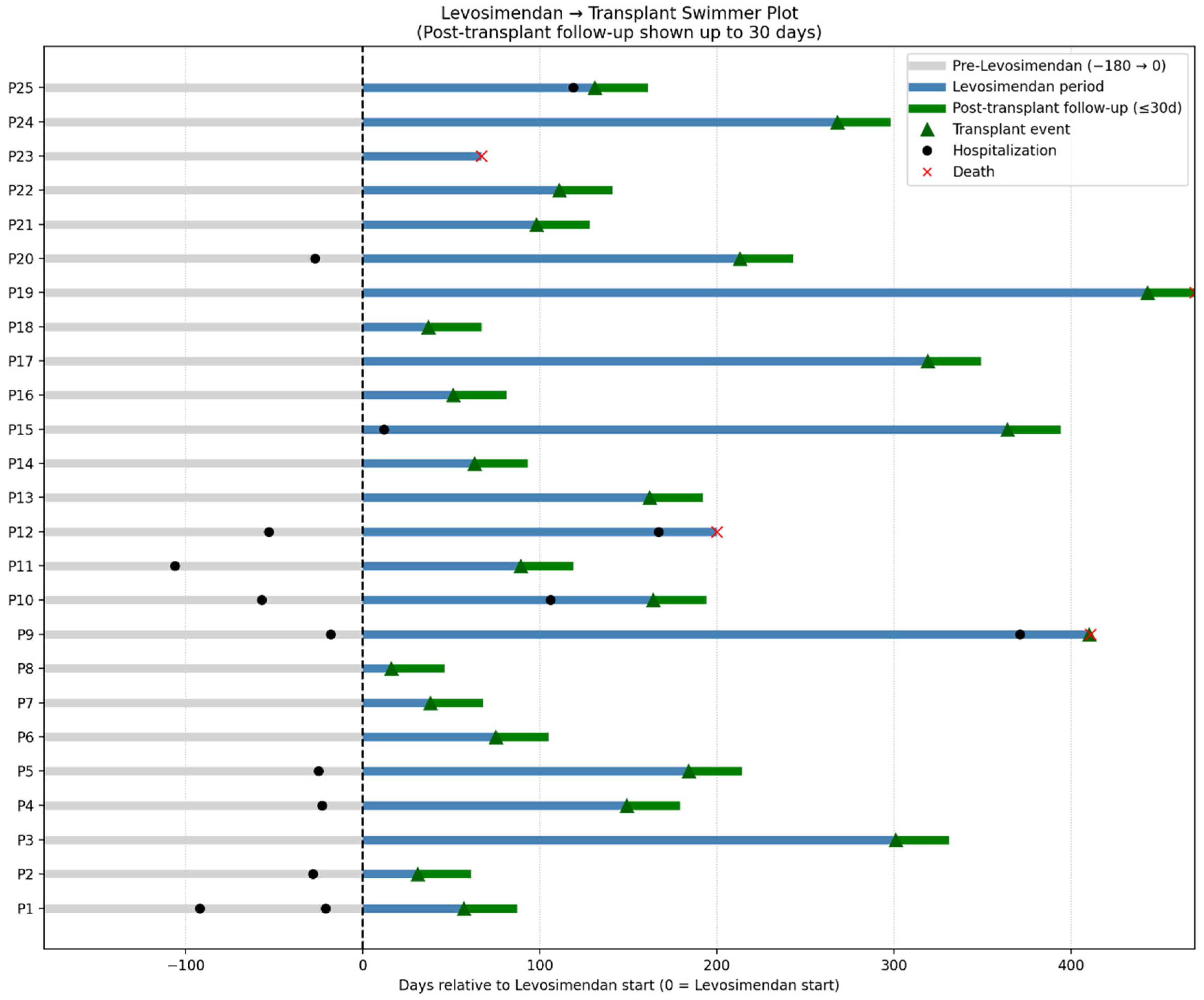The individual trajectories from six months before levosimendan initiation through transplantation and 30-day post-transplant follow-up are shown in