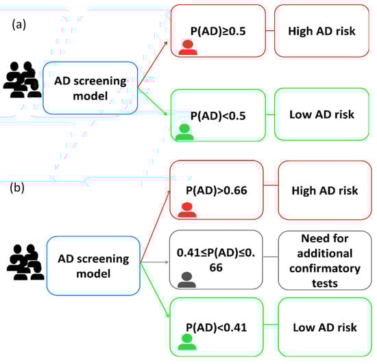 In the present work, both approaches (one-cut-off, two-cut-off) were compared. Overall, similar results were obtained in AUC (0.888 and 0.867, respectively), accuracy (77.4% and 77.1%, respectively) and PPV (96.5% and 100%). Although both methods demonstrated comparable performance, subtle differences were noted between them. The NPV and specificity were slightly higher, while the sensitivity was lower in the two-cut-off approach. Therefore, this is a suitable screening approach, since only 8% of the cases identified as non-AD were misclassified, and the uncertain cases reached 48% of the analyzed cases. On the other hand, the one-cut-off approach misclassified 19% of the identified non-AD cases and there is not an uncertain area. From this, the two-cut-off approach could be suitable for clinical implementation, representing a powerful validated screening tool.