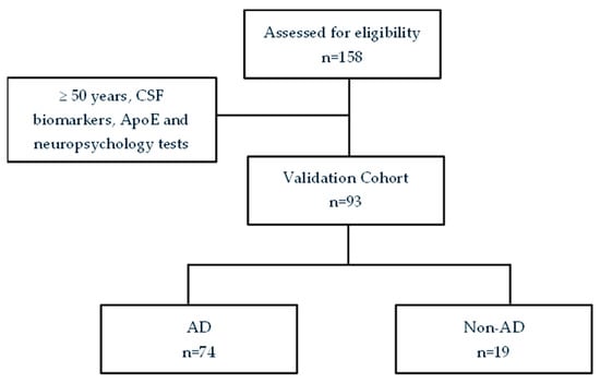 The validation cohort of this observational pilot study consists of 93 patients enrolled in the project from 2023 to 2024 in the Cognitive Impairment Unit of Hospital Universitari i Politècnic La Fe (Valencia, Spain). They showed memory complaints. Their diagnosis was based on CSF Aβ42/Aβ40 levels and neuropsychological tests, according to standard criteria of the National Institute of Aging-Alzheimer’s Association [22,23,24].