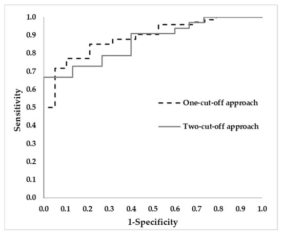 Both approaches showed similar performance, with similar values in terms of AUC, PPV, NPV, and accuracy. However, the two-cut-off approach showed higher specificity and lower sensitivity compared to the one-cut-off approach (see Table 4).