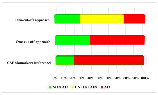 Figure 5 illustrates the AD risk stratification for each approach (one-cut-off, two-cut-offs), as well as the reference CSF classification. As can be seen, CSF analysis classified 80% (n = 74) of the patients as AD, and 20% (n = 19) of them as non-AD. The one-cut-off approach classified the patients as AD (61%; n = 57) and non-AD (39%; n = 36). In this case, 19% of the cases identified as non-AD showed inconsistency with the reference classification (CSF biomarkers). The two-cut-off approach classified the patients as AD (24%, n = 22), non-AD (28%, n = 26), and 48% as uncertain cases (n = 45). In this case, 8% of the cases identified as non-AD showed a discrepancy with the reference classification based on CSF Aβ42/Aβ40 levels.