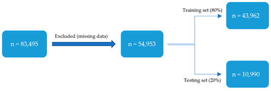 A total of 54,593 patients who underwent C-section between 2012 and 2022 were included in the study, of which 80% and 20% were split into the training and testing sets respectively (Figure 1). Of these, 1306 (2.39%) experienced a 30-day hospital readmission. The baseline characteristics of the readmitted and non-admitted cohorts are detailed in Table 1.