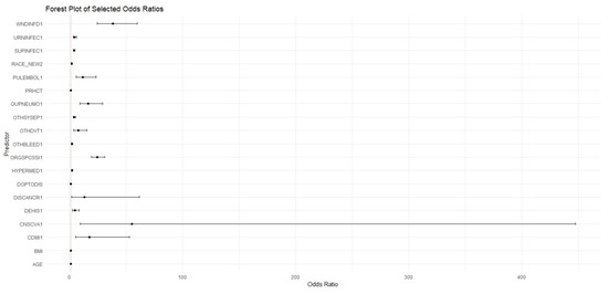 Forest Plot of Odds Ratios of Statistically Significant Predictors Computed from Logistic Regression Model. (WNDINFD1: Wound Disruption; URNINFEC1: Urinary Tract Infection; SUPINFEC1: Superficial Surgical Site Infection; RACE_NEW2: African American Race; PULEMBOL1: Pulmonary Embolism; PRHCT: Preoperative Hematocrit; OUPNEUMO1: Pneumonia; OTHSYSEP1: Sepsis; OTHDVT1: Deep Vein Thrombosis Requiring Therapy; OTHBLEED1: Bleeding Requiring a Transfusion (within 72 h); ORGSPCSSI1: Organ/Space Surgical Site Infection; HYPERMED1: Hypertension Requiring Medication; DOPTODIS: Days from Operation to Discharge; DISCANCR1: Disseminated Cancer; DEHIS1: Wound Disruption; CNSCVA1: Cerebrovascular Accident (Stroke); CDMI1: Myocardial Infarction; BMI: Body Mass Index; AGE: Age).