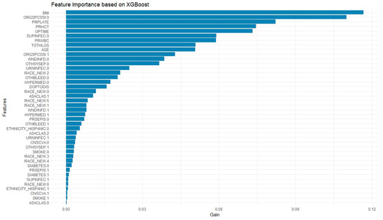 Feature Importance Plot from XGBoost Model. (BMI: Body Mass Index; ORGSPCSSI: Organ/Space Surgical Site Infection; PRPLATE: Preoperative Platelet Count; PRHCT: Preoperative Hematocrit; OPTIME: Total Operation Time (minutes); SUPINFEC: Superficial Surgical Site Infection; PRWBC: Preoperative White Blood Cell Count; TOTHLOS: Total Hospital Length of Stay; AGE: Age (in years, top-coded at 90+); WNDINFD: Deep Incisional Surgical Site Infection; OTHSYSEP: Sepsis; URNINFEC: Urinary Tract Infection; RACE_NEW: Race (categorical variable); OTHBLEED: Bleeding Requiring a Transfusion (within 72 h); HYPERMED: Hypertension Requiring Medication; DOPTODIS: Days from Operation to Discharge; ASACLAS: ASA Physical Status Classification; PRSEPIS: Preoperative Sepsis; CNSCVA: Cerebrovascular Accident (Stroke); SMOKE: Smoking Status (within 1 year); ETHNICITY_HISPANIC: Hispanic/Latino Ethnicity; DIABETES: Diabetes Mellitus).