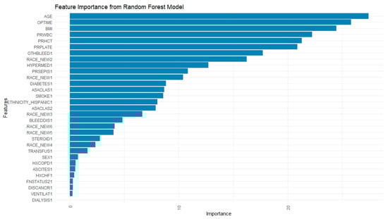 Feature Importance Plot from Random Forest Model Using All Predictor Variables. (BMI: Body Mass Index; ORGSPCSSI: Organ/Space Surgical Site Infection; PRPLATE: Preoperative Platelet Count; PRHCT: Preoperative Hematocrit; OPTIME: Total Operation Time (minutes); SUPINFEC: Superficial Surgical Site Infection; PRWBC: Preoperative White Blood Cell Count; TOTHLOS: Total Hospital Length of Stay; AGE: Age (in years, top-coded at 90+); WNDINFD: Deep Incisional Surgical Site Infection; OTHSYSEP: Sepsis; URNINFEC: Urinary Tract Infection; RACE_NEW: Race (categorical variable); OTHBLEED: Bleeding Requiring a Transfusion (within 72 h); HYPERMED: Hypertension Requiring Medication; DOPTODIS: Days from Operation to Discharge; ASACLAS: ASA Physical Status Classification; PRSEPIS: Preoperative Sepsis; CNSCVA: Cerebrovascular Accident (Stroke); SMOKE: Smoking Status (within 1 year); ETHNICITY_HISPANIC: Hispanic/Latino Ethnicity; DIABETES: Diabetes Mellitus).