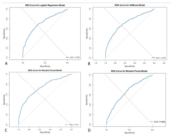 Receiver Operating Characteristic (ROC) Curves for (A) Logistic Regression, (B) Extreme Gradient Boosting (XGBoost) and (C) Random Forest. (D) Random Forest ROC Curve Using Only Pre-Operative Variables.