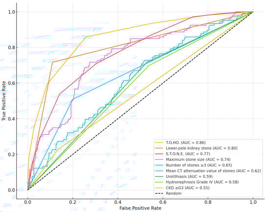 To evaluate discriminatory ability, ROC curves were generated for both the T.O.HO. and S.T.O.N.E. scoring systems as well as for selected clinical predictors (Table 4, Figure 1). The T.O.HO. model showed the strongest performance in forecasting SF outcomes, with an AUC of 0.86 (95% CI: 0.82–0.90). This was significantly higher than the AUC obtained for the S.T.O.N.E. score (AUC: 0.77; 95% CI: 0.72–0.83; p < 0.01).