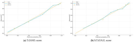 Figure 2a,b plot observed versus predicted SF probabilities; curves close to the 45° line indicate good calibration, which was acceptable for both scores. Figure 3 shows decision curves; across thresholds 0.20–0.60, the T.O.HO. curve lies above S.T.O.N.E. and the “treat-all/none” strategies, indicating greater clinical utility and supporting pragmatic cut-off selection.