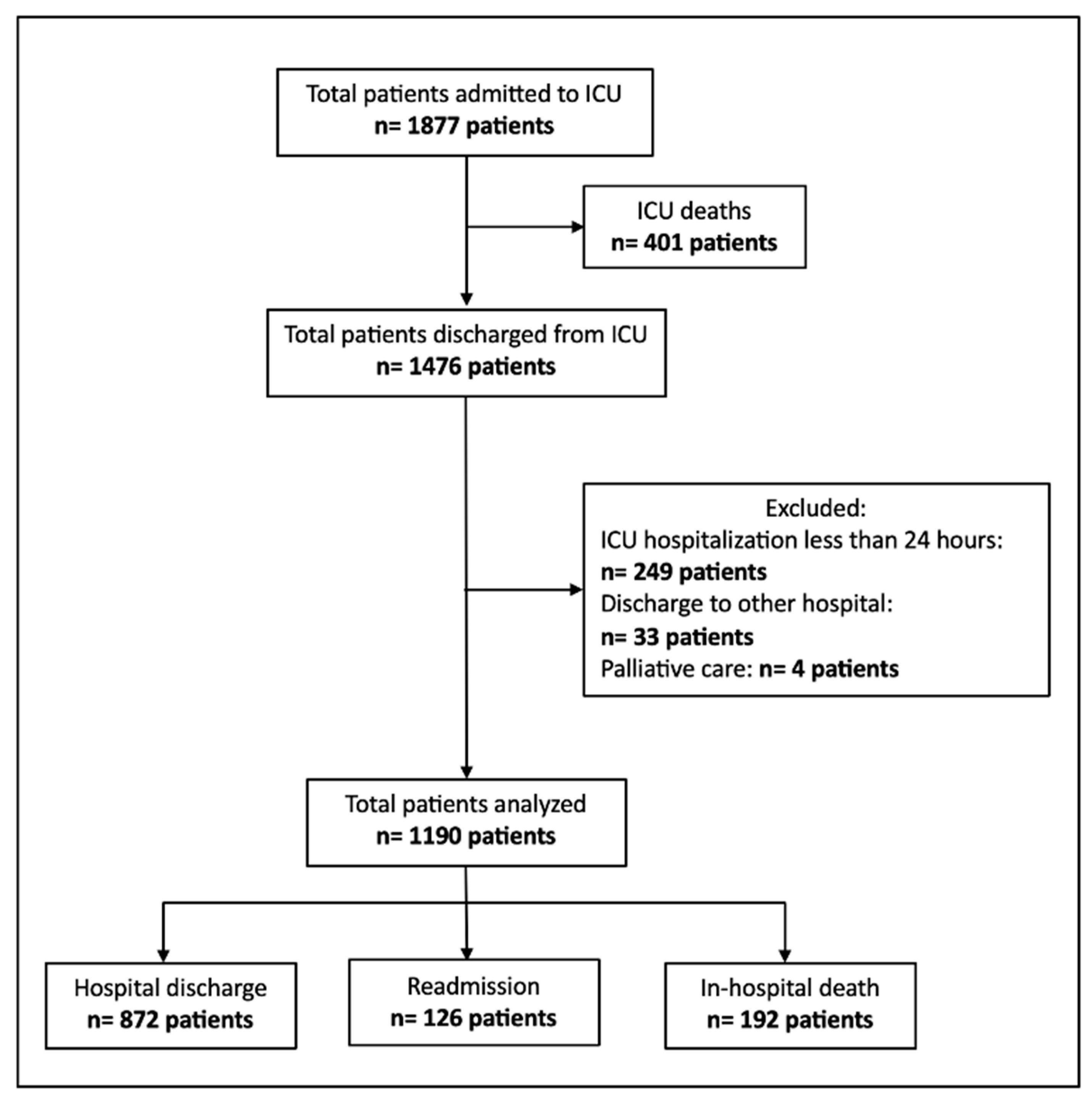 - Ponzoni, C.R.; Corrêa, T.D.; Filho, R.R.; Neto, A.S.; Assunção, M.S.C.; Pardini, A.; Schettino, G.P.P. Readmission to the Intensive Care Unit: Incidence, Risk Factors, Resource Use, and Outcomes. A Retrospective Cohort Study. Ann. Am. Thorac. Soc. 2017, 14, 1312–1319. [Google Scholar] [CrossRef]