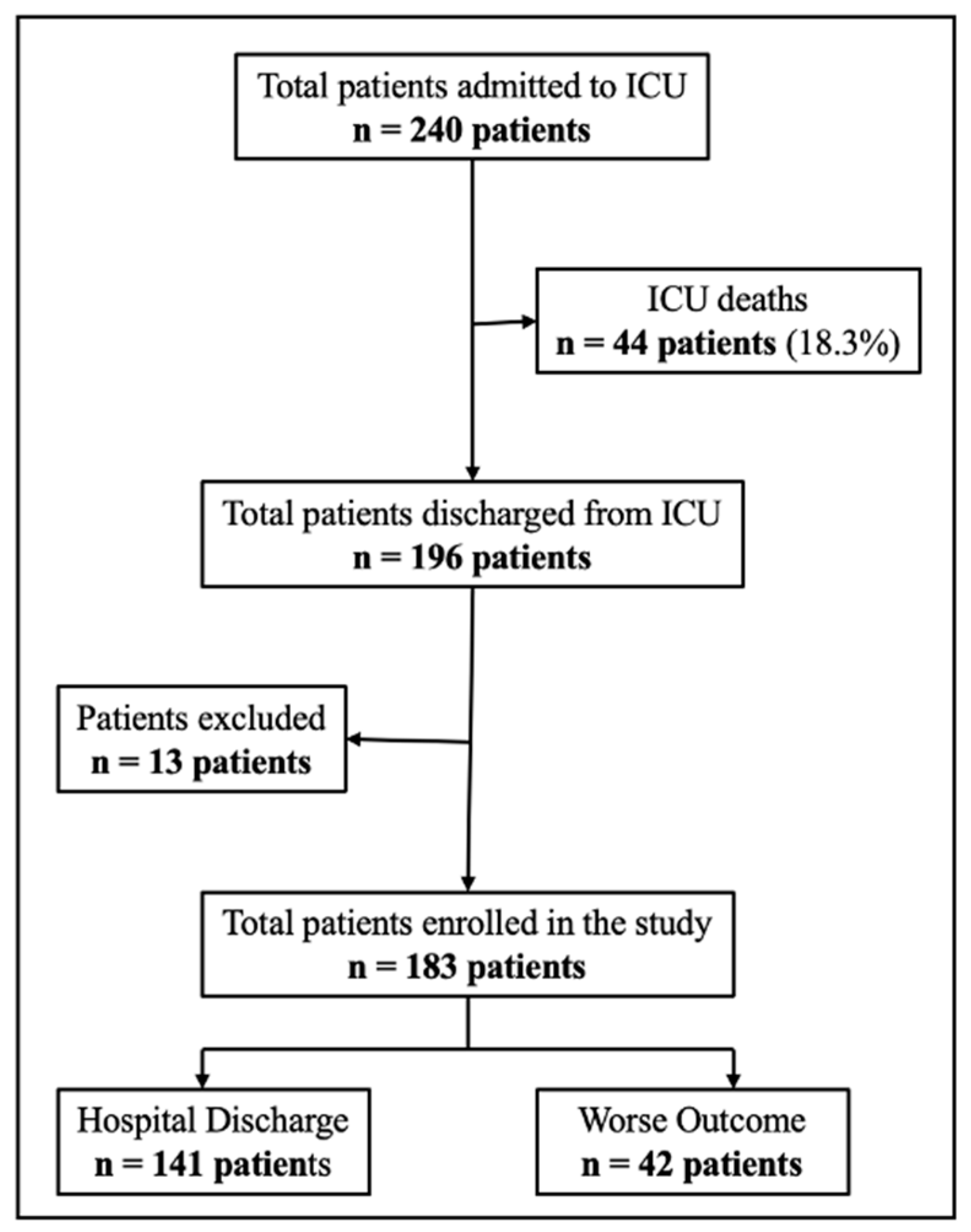- Rosa, R.G.; Falavigna, M.; Robinson, C.C.; Sanchez, E.C.; Kochhann, R.; Schneider, D.; Sganzerla, D.; Dietrich, C.; Barbosa, M.G.; de Souza, D.; et al. Early and Late Mortality Following Discharge From the ICU: A Multicenter Prospective Cohort Study. Crit. Care Med. 2020, 48, 64–72. [Google Scholar] [CrossRef] [PubMed]