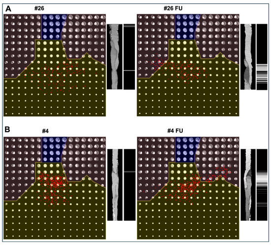 Representative examples of thrombus progression ((A), Patient #26) and regression ((B), Patient #4) after FET surgery (left = postoperative, right = follow-up). On the left side of each panel, the two-dimensional latent space generated by the variational autoencoder is shown. The latent space is divided into three clinically interpretable regions: no thrombus (yellow), partially thrombosed false lumen (unshaded), and fully thrombosed false lumen (blue). Each red dot represents one axial aortic slice encoded into the latent space. The radial distance from the origin corresponds to the thrombus score, with larger distances indicating greater false lumen thrombus burden. On the right side of each panel, a multiplanar reconstructed lateral view of the aorta along the centerline is displayed, and a grayscale map illustrates the slice-wise thrombus score (black = no thrombus; white = maximum thrombus burden).