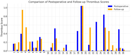 Patient-specific thrombus scores derived from cross-sectional CTA images using the VAE model. Each pair of bars represents one patient, with the blue bar showing the score at the early postoperative scan and the orange bar showing the score at follow-up. The y-axis shows the average thrombus score.
