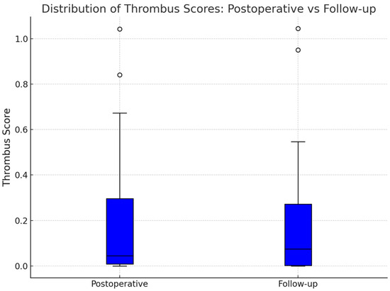 To formally assess changes in thrombus scores over time, we first evaluated the distribution of paired differences for normality. The D’Agostino and Pearson omnibus test did not reveal any significant deviation from a normal distribution (statistic = 1.79, p = 0.41), validating the use of a paired t-test for further analysis. The paired t-test comparing thrombus scores at baseline and follow-up yielded a t-statistic of 0.23 and a two-sided p-value of 0.82, indicating no statistically significant difference in mean thrombus scores across the full cohort. These findings imply that, while many patients experienced relevant individual changes in FL thrombus burden, these shifts were bidirectional and canceled each other out at the group level.