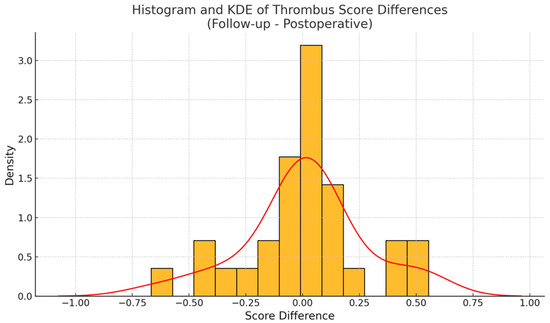 Although individual remodeling trajectories were diverse, a modest trend toward Okincreased FL thrombosis was observed at the population level. Boxplots of thrombus scores showed a slight upward shift in the distribution at follow-up (Figure 4). Additionally, a histogram of thrombus score differences (Figure 5) revealed a right-skewed distribution, with a smoothed kernel density estimate curve that peaked just above zero, further supporting the notion of mild FL thrombosis progression in a subset of patients.