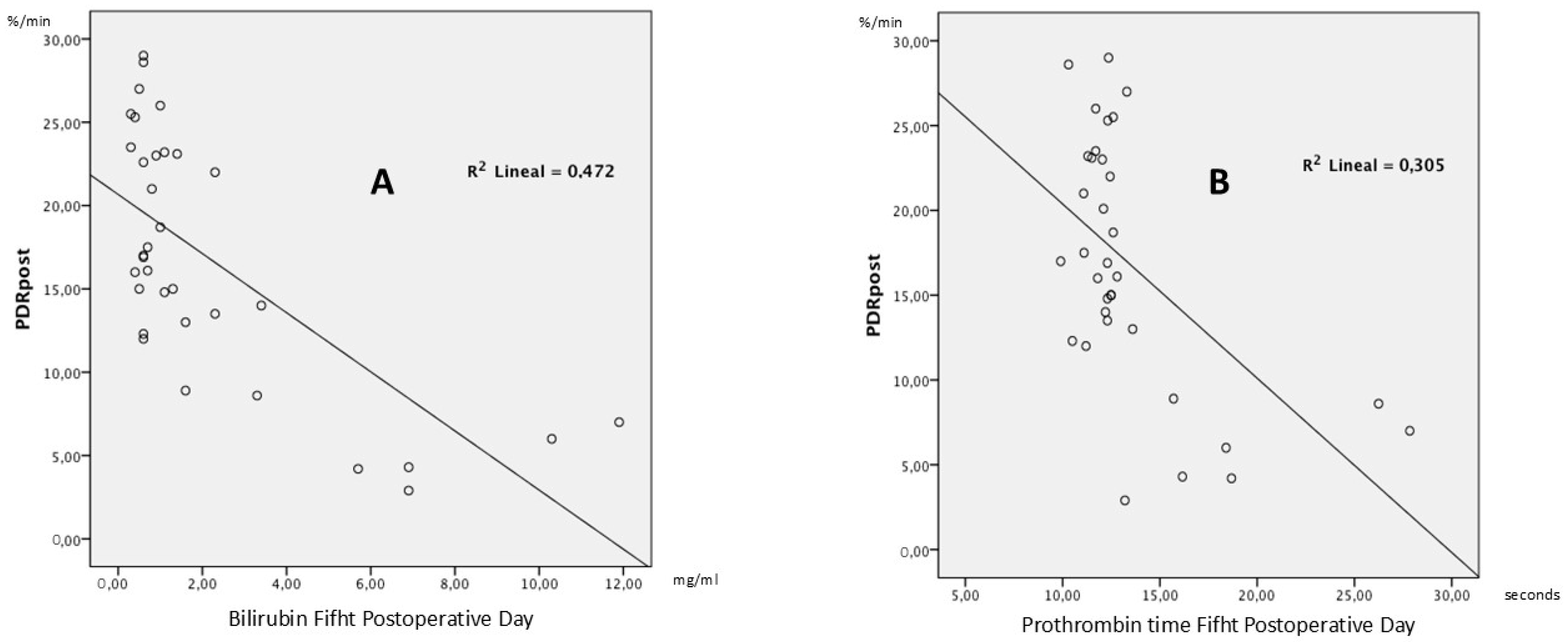 - Olmedilla, L.; Pérez-Peña, J.M.; Ripoll, C.; Garutti, I.; De Diego, R.; Salcedo, M.; Jiménez, C.; Bañares, R. Early Noninvasive Measurement of the Indocyanine Green Plasma Disappearance Rate Accurately Predicts Early Graft Dysfunction and Mortality after Deceased Donor Liver Transplantation. Liver Transplant. 2009, 15, 1247–1253. [Google Scholar] [CrossRef]