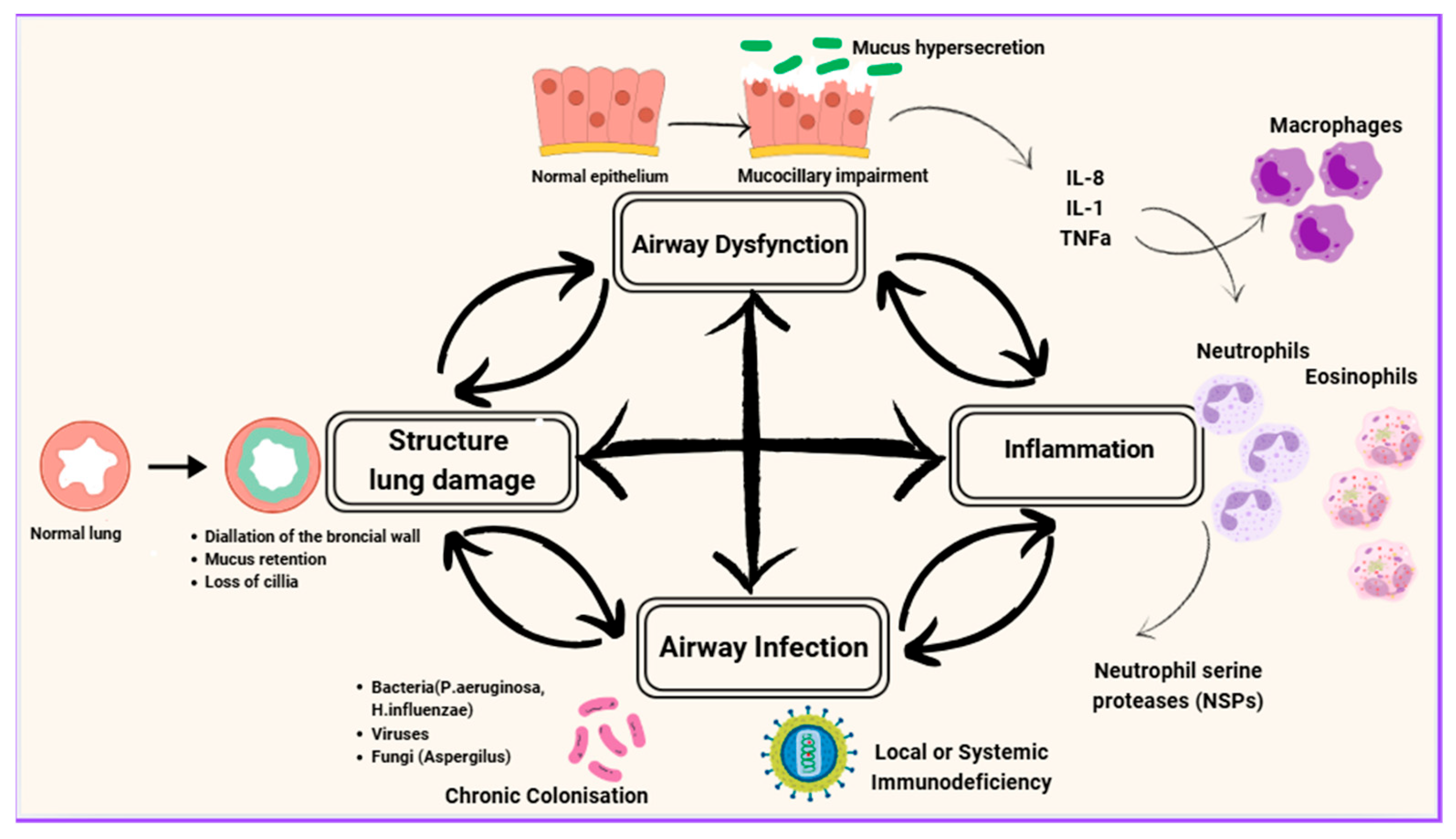 5]. A complex interplay between inflammation and infectious processes lies at the core of the disease’s pathophysiology, leading to the permanent airway dilation [